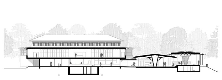 Der Erweiterungsneubau ist, wie auch schon das Hauptgebäude, unter grösstmöglicher Wahrung des bestehenden Baumdachs, nahe an die steil ansteigende Aareböschung zwischen dem eigentlichen Restaurant Dählhölzli und dem Pelikangehege situiert, ohne dabei den rückwertigen Zugang zu den Gehegen und den Parkplätzen zu vernachlässigen.Einzelne, freistehend wirkende Pavillons bilden den Neubau, der sich mit seiner Staffelung im Grundriss und in der Höhe, harmonisch in die bestehende Gartenterrasse mit seiner historischen Baumstruktur einfügt. Die Pavillons greifen leicht ineinander und schliessen dementsprechend dezent am Hauptgebäude an. Der Neubau konkurrenziert sich nicht mit dem Hauptgebäude. Die Formensprache ist mit den beiden Treppentürmen des bestehenden Gebäudes nicht fremd und ist auch im weiteren Tierpark immer wieder auffindbar, trotzdem ist der neue Bau deutlich als Erweiterung wahrnehmbar. Aus Sicht des Passanten wirken die Pavillons wie festinstallierte Schirme. Der gedeckte Aussensitzbereich unterstreicht dies. Die als unschätzbare Qualität eingestufte Atmosphäre unter dem Baumdach wird im Innenbereich weitergeführt. Dank der grosszügigen Verglasung, die im Sommer komplett geöffnet werden kann, ist der Übergang zwischen Innen und Aussen fliessend und der Erweiterungsneubau wird letzendlich zur Erweiterung der Gartenterrasse. Die Haupttragkonstruktion bildet ein räumliches, radial angeordnetes Holzfaltwerk, dass der örtlichen Tradition bedeutender Holzbauten, wie dem Restaurant Dählhölzli selber und dem Bärenhaus, folgen will. Das räumliche Faltwerk, als effizientes Tragwerk, ist der Natur wie z.B. der Fächerpalme abgeleitet. Die Tragfähigkeit wird durch die räumliche Faltung entscheidend verbessert. Die vorgesehene Faltung ruht auf der Grundlage der Rautenfaltung, d.h. die Faltung besteht nur aus dreieckigen und damit ebenen Flächen. Zusätzliche Gegenfaltungen erhöhen die Steifigkeit des gesamten Systems. Als Material bietet sich das Brettsperrholz an und wird als 5-schichtige Platte mit zusätzlicher Decklage in Sichtqualität in einer Gesamtstärke von 189mm vorgesehen. Die Brettsperrholzelemente können exakt und individuell angefertigt werden und können durch eine einfache und systematische Verbindungstechnik schnell auf der Baustelle montiert werden. Die Sichtoberfläche bleibt roh und unbehandelt. Auch die weiteren Oberflächen zeigen bewusst das Konstruktionsmaterial. Im Gegensatz dazu hebt sich die Möblierung im edlen Lärchenholz ab. Oberflächen werden nur dort geschützt, wo es aus betrieblicher Sicht notwendig ist und Sinn macht. Die Unterhaltskosten werden damit gering gehalten. Es werden ausschliesslich einheimische Hölzer verwendet. Durch die Verwendung von vorgefertigten Elementen der Tragkonstruktion und der Hülle ist ein schneller und wirtschaftlicher Baufortschritt gewährleistet. Das trotz der hohen Räume kompakte Gebäudevolumen, die klare und einfache Gebäudestruktur und die sinnvolle Erschliessung aller Räume gewährleisten auch in Betrieb und Unterhalt eine optimale Wirtschaftlichkeit.